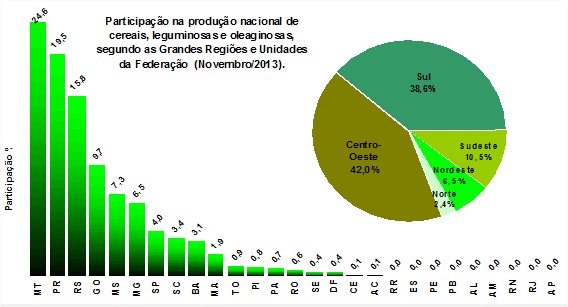 Entre as Grandes Regiões, o volume da produção de cereais, leguminosas e oleaginosas apresentou a seguinte distribuição: Centro-Oeste, 78,4 milhões de toneladas; Região Sul, 72,2 milhões de toneladas; Sudeste, 19,6 milhões de toneladas; Nordeste, 12,0 milhões de toneladas e Norte, 4,6 milhões de toneladas. Em relação à safra passada, houve altas de 10,8% na Região Centro-Oeste, 30,7% na Sul, 1,9% na Sudeste e 1,4% na Nordeste. Na Região Norte houve queda de 3,8%. Nessa avaliação para 2013, o Mato Grosso liderou em produção de grãos, com uma participação de 24,6%, seguido pelo Paraná (19,5%) e Rio Grande do Sul (15,8 %), que somados representaram 59,9% do total nacional previsto.